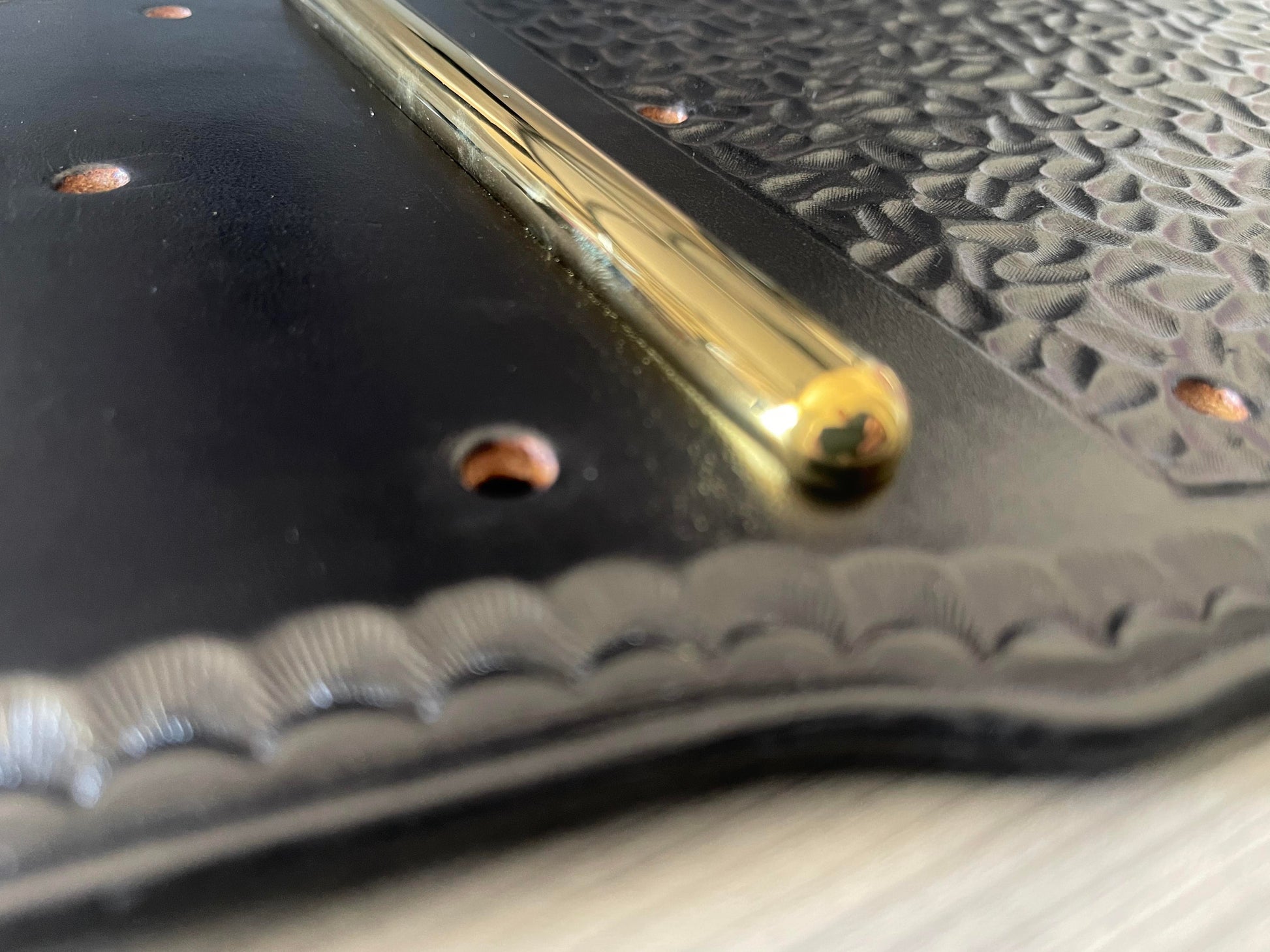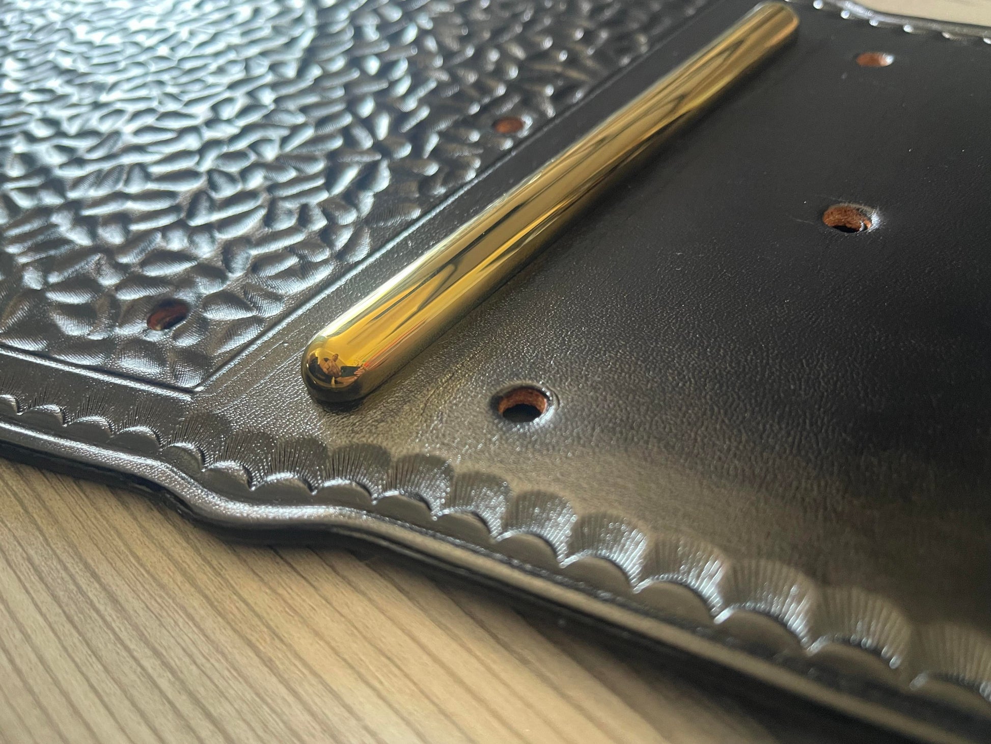 This will include the leather strap with the screws exposed in the back and the upgraded side bars